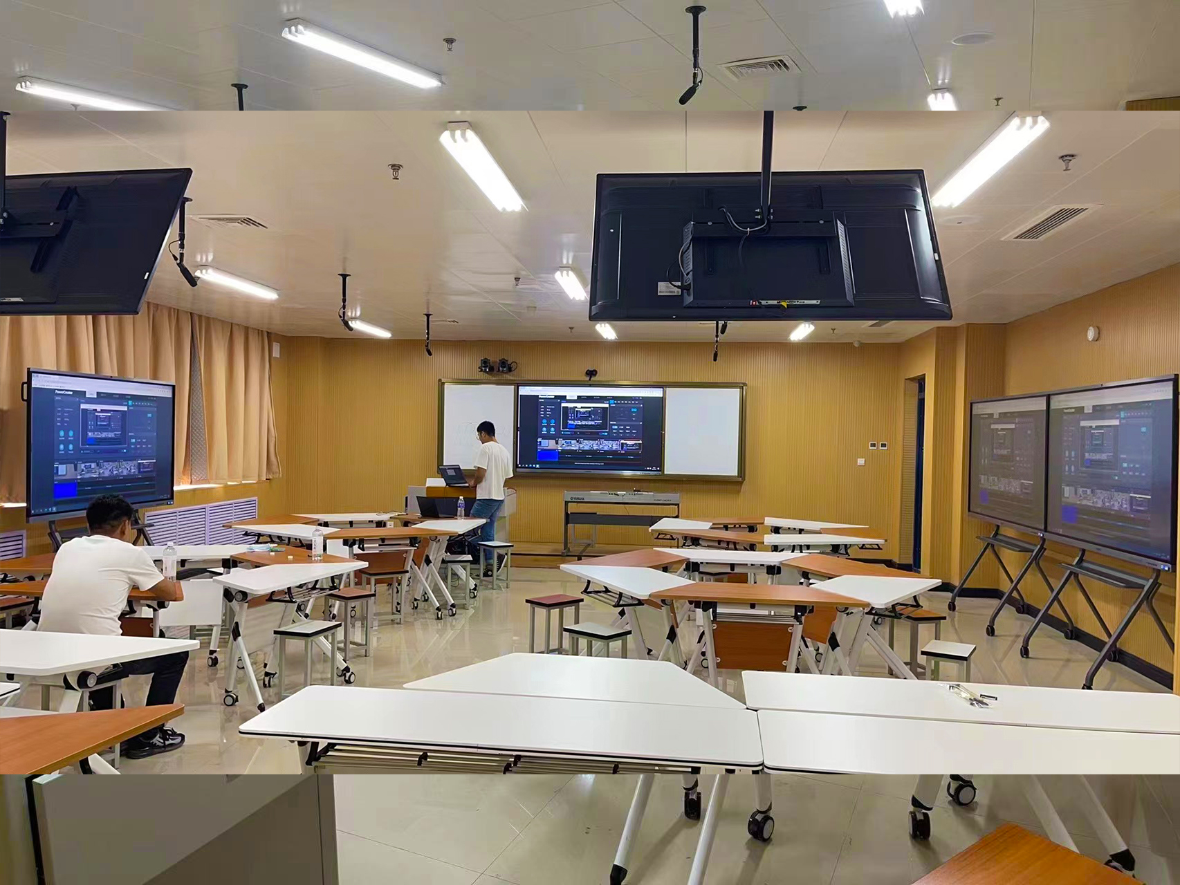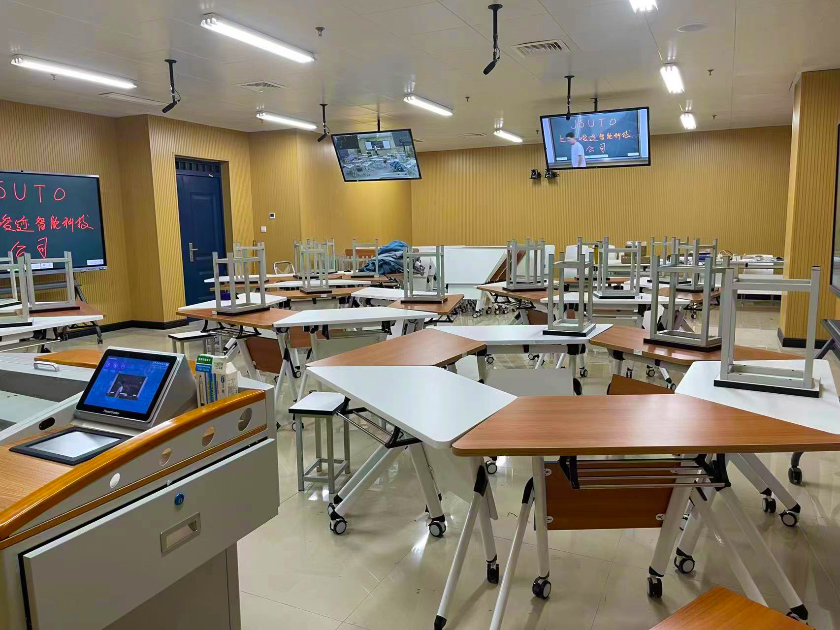 设计过程中除了常规的多媒体设备,还加入了本公司创意设计。安装智能中控系统,一键控制教室内的窗帘灯光电脑开关等,省时省力;安装左右推拉的书写白板,老师在多媒体讲课的过程中也可以随时使用白板协助教学;安装录播/人脸识别系统,对于学生的到课情况等进行查询回访,节约人力物力;安装教师监看屏,老师看到个别学生偶尔没有用心上课的时候可以及时提醒。